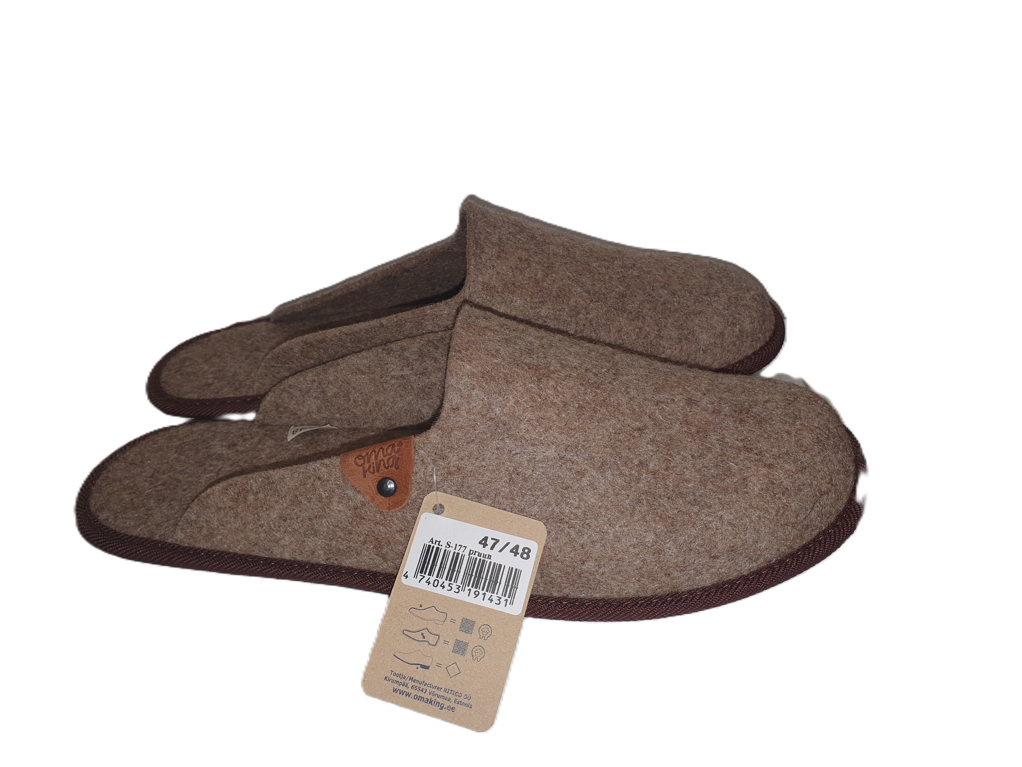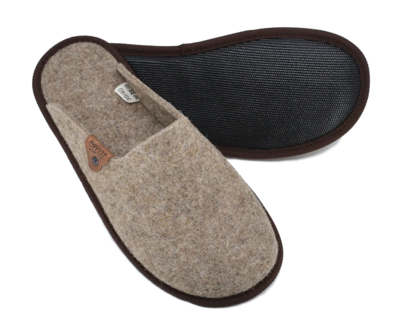 Omaking Pelsi aamutossut ovat luonnollisesta villahuovasta valmistetut helposti jalkaan pistettävät vaaleanruskeat sisätohvelit. Ohut ulkopohja on kumia.