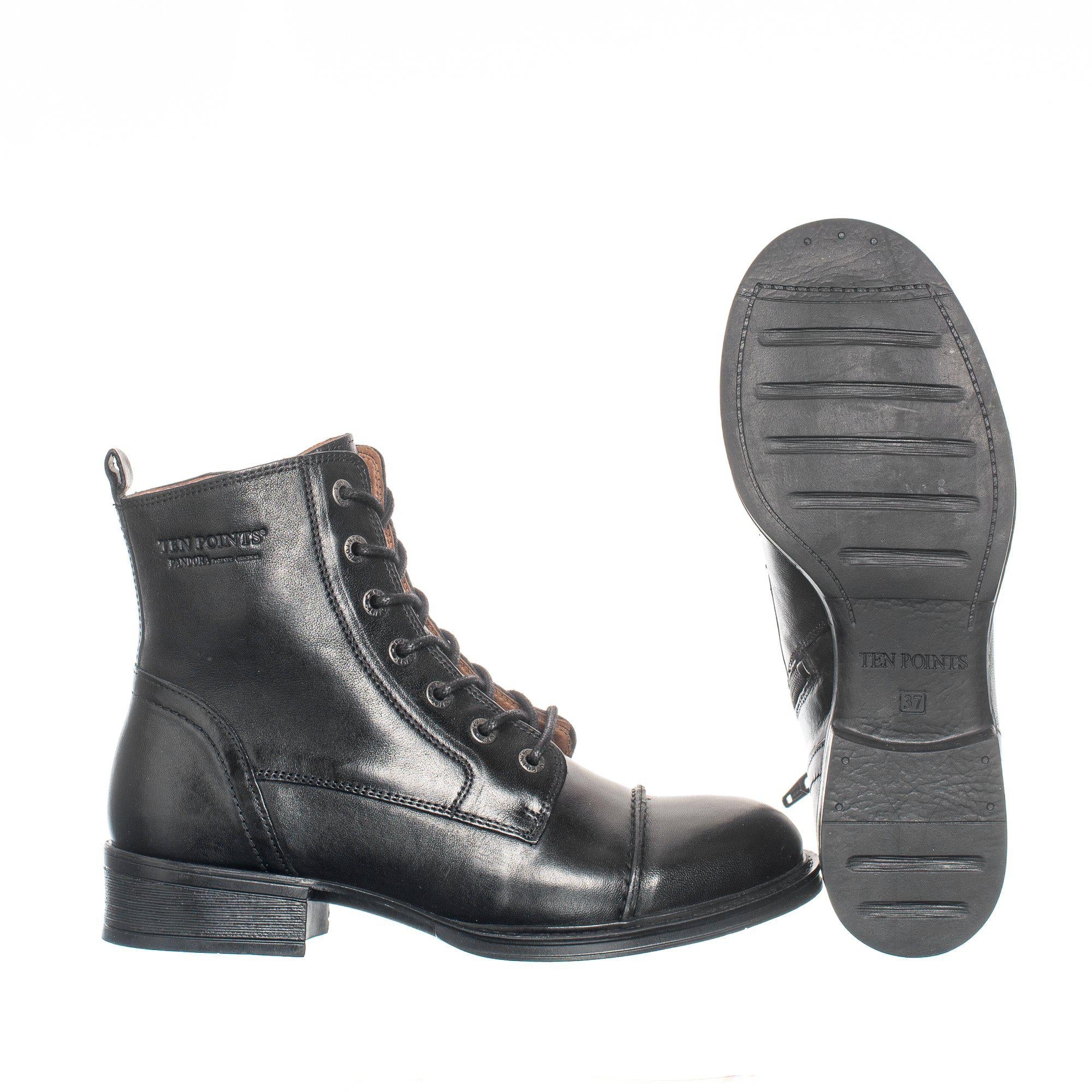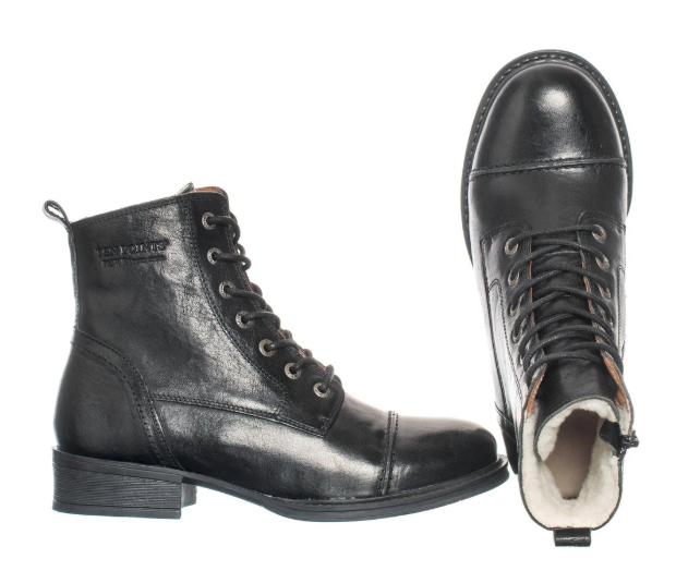 Ten Pointsin talvinilkkuri Pandora 60003 lämpimällä villavuorilla ja -pohjallisella mustana. Pinta laadukasta kromivapaata nahkaa. Kätevä vetoketju sisäsivulla helpottaa jalkaan laittamista ja 7-rivinen nauhoitus viimeistelee istuvuuden. Kiinteä lämmin pohjallinen. Ulkopohja TR-kumiseos 3 cm kantakorolla.