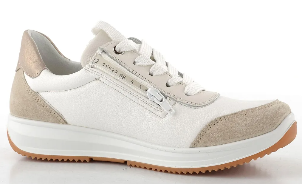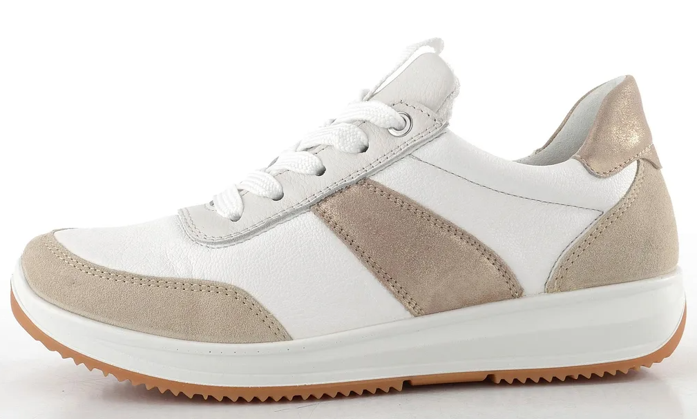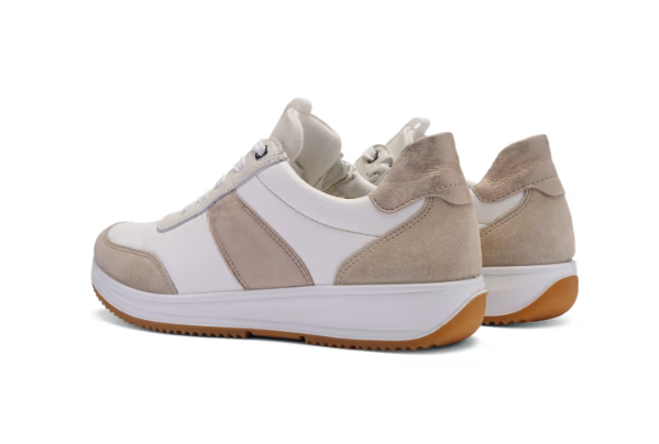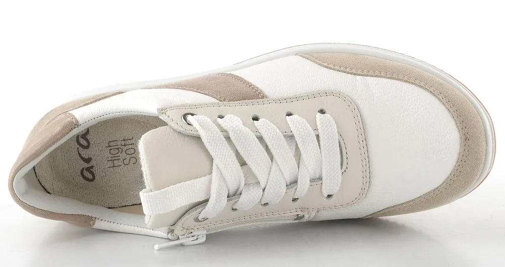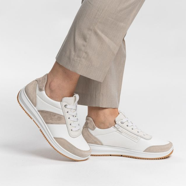Ara Osaka 3.0 vaaleassa värissä valkoisella nahalla, jossa beigeä ja metallinhohtoisia yksityiskohtia. Päällinen on laadukasta nahkaa. Valkoiset nahkaosiot ovat lisäksi joustavampaa Stretch-nahkaa. Irroitettava Ara Bamboo High Soft pohjallinen on mukavan pehmeä ja muotoutuva.